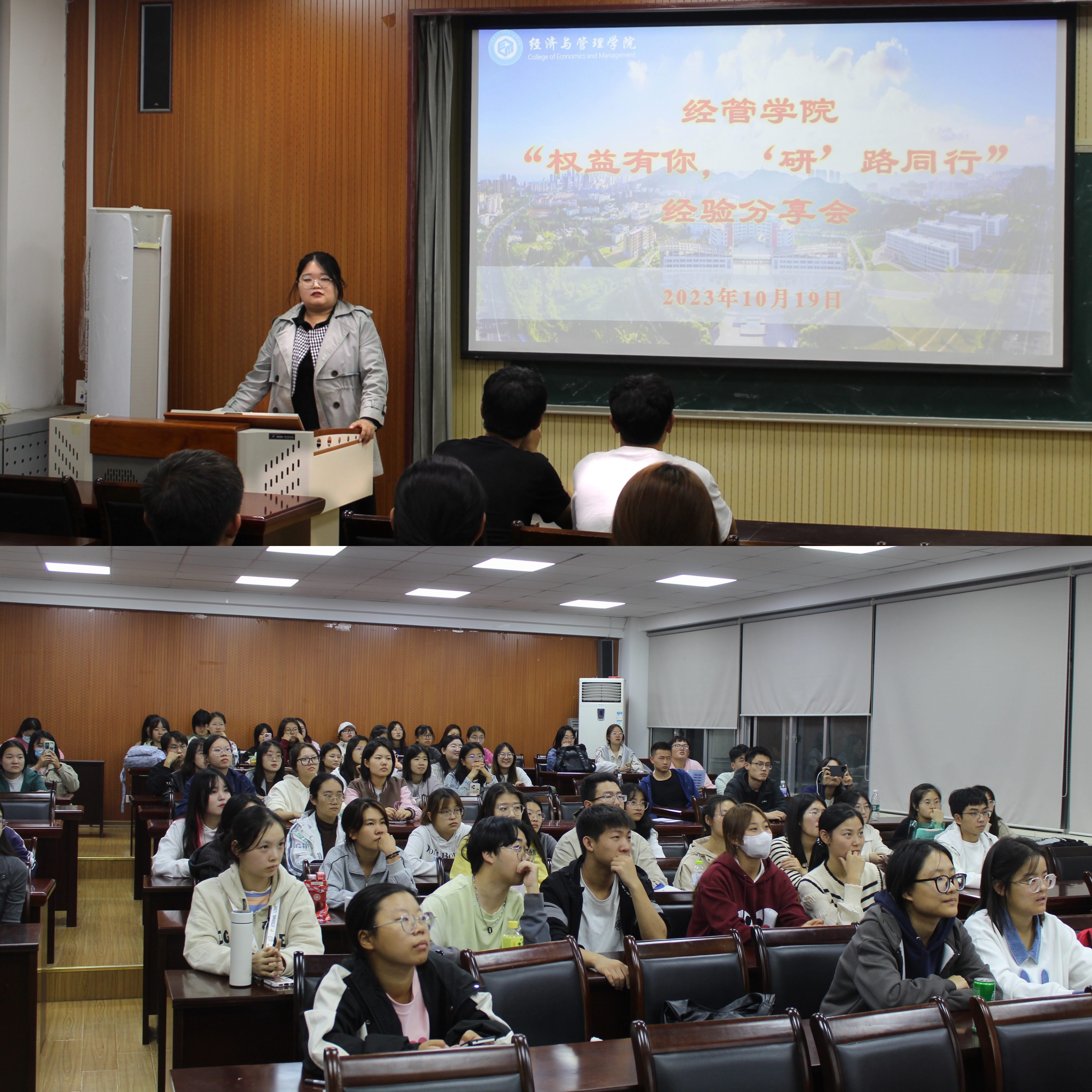 为积极发挥优秀学子带头示范作用,更好引导拉斯维加斯官网学生认真制定学业及成长规划,树立积极的学习目标,帮助同学们解答研究生推免相关问题,经管学院团委于10月19日晚在419会议室举办“权益与你,‘研’路同行”推免经验分享会。