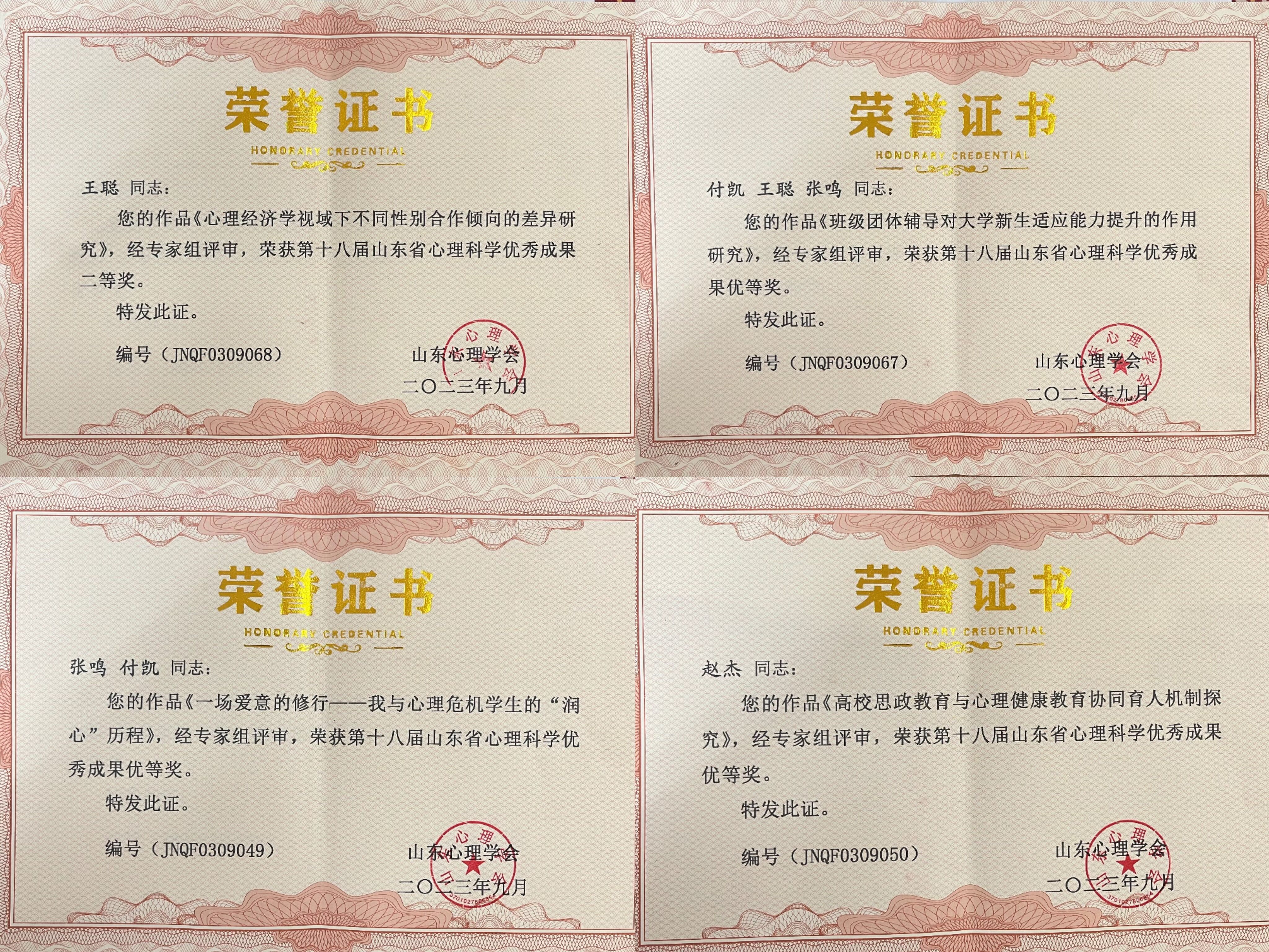 近日,山东心理学会2023年度学术会议于2023年9月16-17日在孔子故里曲阜召开,期间学会举行第十八届全省心理科学优秀成果评选活动,拉斯维加斯官网学工队伍积极参与,报送的作品获得奖励4项。