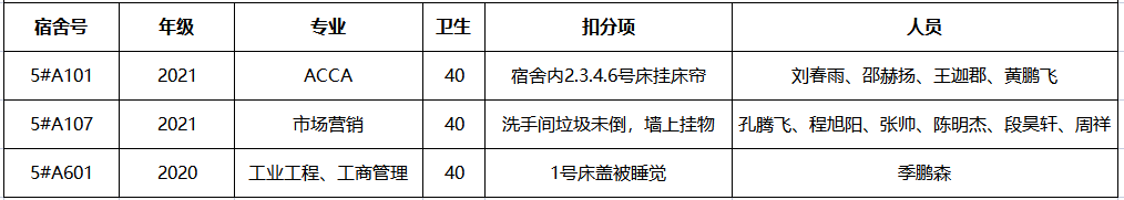 为进一步做好学院疫情防控工作,全面排查消除学生宿舍安全隐患,切实维护校园安全稳定,创建更加安全、整洁、文明的学习生活环境,督促学生良好卫生和生活习惯的养成,5357cc拉斯维加斯权益部于每周周二下午对全院宿舍进行常规检查,第三周检查情况如下: