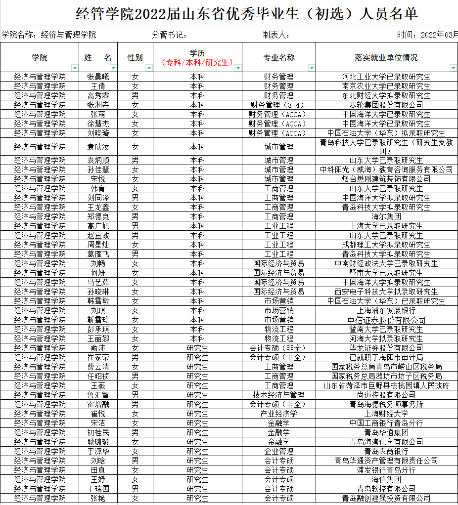 根据学校《关于开展2022届山东省优秀毕业生评选工作的通知》的具体要求,经个人申请、资格审查,在综合测评和民主评议的基础上,秉着公开、公平、公正的原则,现将经管学院2022届山东省优秀毕业生(初选)人员名单(见下表),予以公示,公示时间:2022年3月18日-22日。