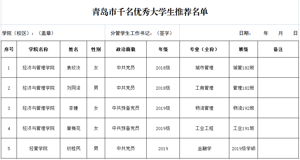 根据学校《关于评选2022年度“青岛市千名优秀大学生”的通知》的要求,经个人申请、材料审核,现将经管学院“青岛市千名优秀大学生”候选人公示如下,公示时间2022年4月4日-2022年4月6日。