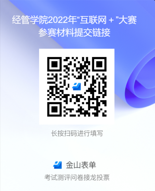 学院各年级需组织各参赛报名团队于2022年4月13日前通过「经管学院2022年“互联网+”大赛参赛材料提交链接https://f.wps.cn/w/1xzxiX4t/」或扫描下方二维码完成参赛材料提交。