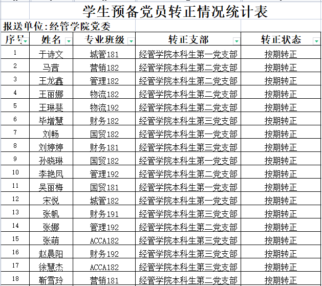 根据《中国共产党章程》和《中国共产党发展党员工作细则》及学校党委《关于发展学生党员工作的意见》(青科大党字〔2014〕77号)文件要求,经管学院本科生党支部于2022年6月10日召开预备党员转正大会讨论于诗文等18位同志的转正问题(按姓氏笔画排序),同意以上同志按期转为中共正式党员,现将该18名同志情况予以公示。公示期为2022年6月10日至2022年6月16日。如有异议,请于公示期内到经管学院党委反映。