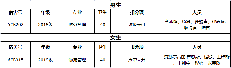 在本次的检查中,除了对宿舍整体卫生情况进行例行检查外,还对消防安全、违禁电器使用进行了重点检查,不合格宿舍如下: