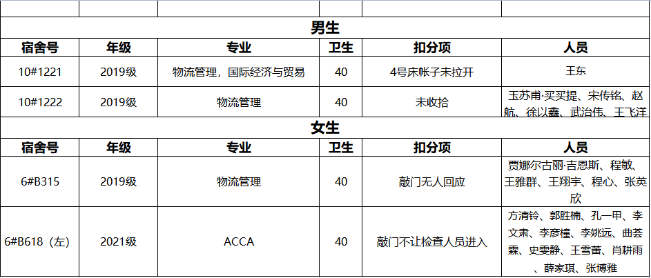 卫生检查结果及扣分细则请见附件,请各年级对照问题监督好不合格宿舍的整改。