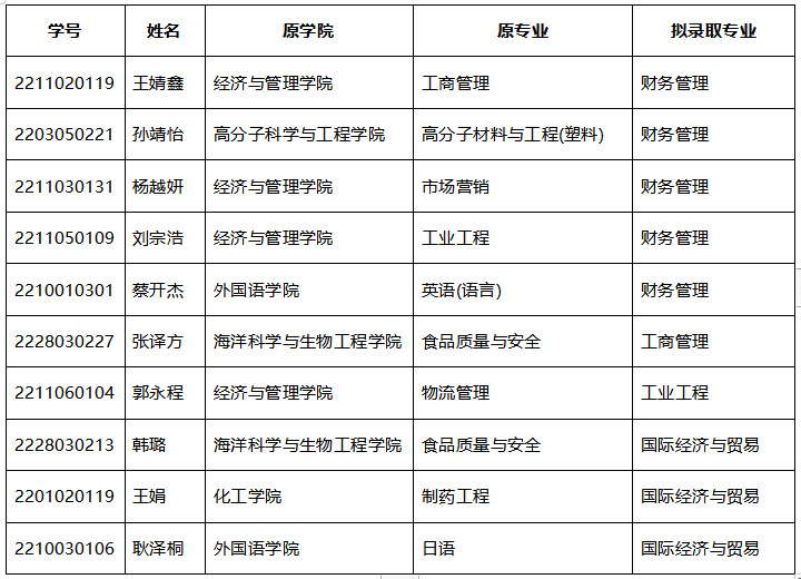 经管学院于2023年3月14日举行转专业考核,经过严格的面试考核,并按照分数从高到低的排序,现将拟录取名单公布如下: