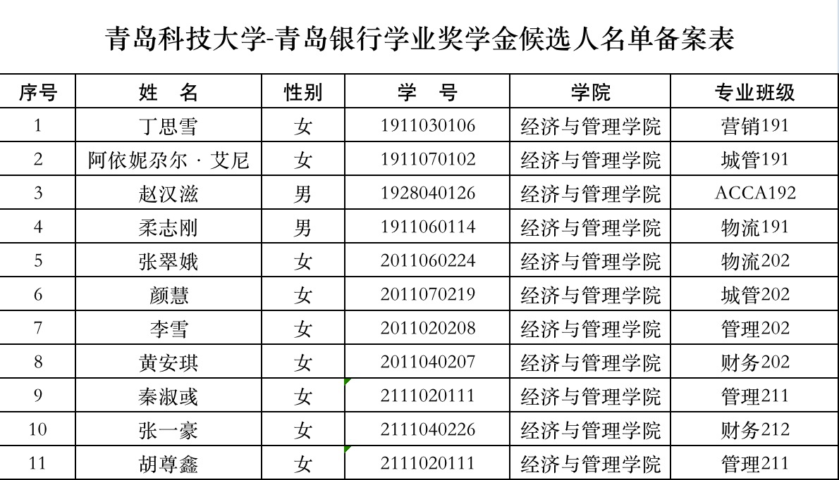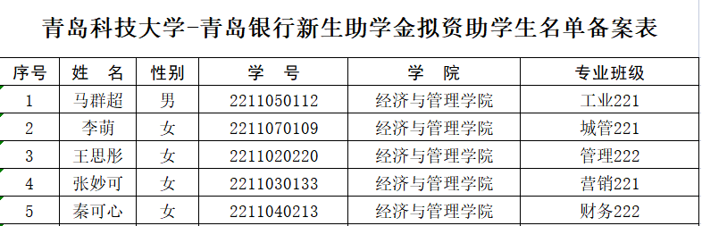 【公示】经管学院2022年度青岛银行奖助学金名单公示