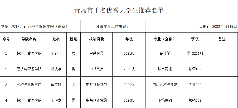 根据学校《关于评选2023年度“青岛市千名优秀大学生”的通知》的要求,经个人申请、材料审核,现将经管学院“青岛市千名优秀大学生”候选人公示如下,公示时间2023年4月18日-2023年4月20日。