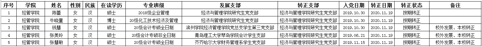 根据《中国共产党章程》和《中国共产党发展党员工作细则》及学校党委《关于发展学生党员工作的意见》(青科大党字〔2014〕77号)文件要求,经管学院研究生党支部于2020年11月19日召开预备党员转正大会讨论陈蕾等5位同志的转正问题,同意以上同志按期转为中共正式党员,现将该5名同志情况予以公示。公示期为2020年11月19日至2020年11月25日。如有异议,请于公示期内到经管学院党委反映。