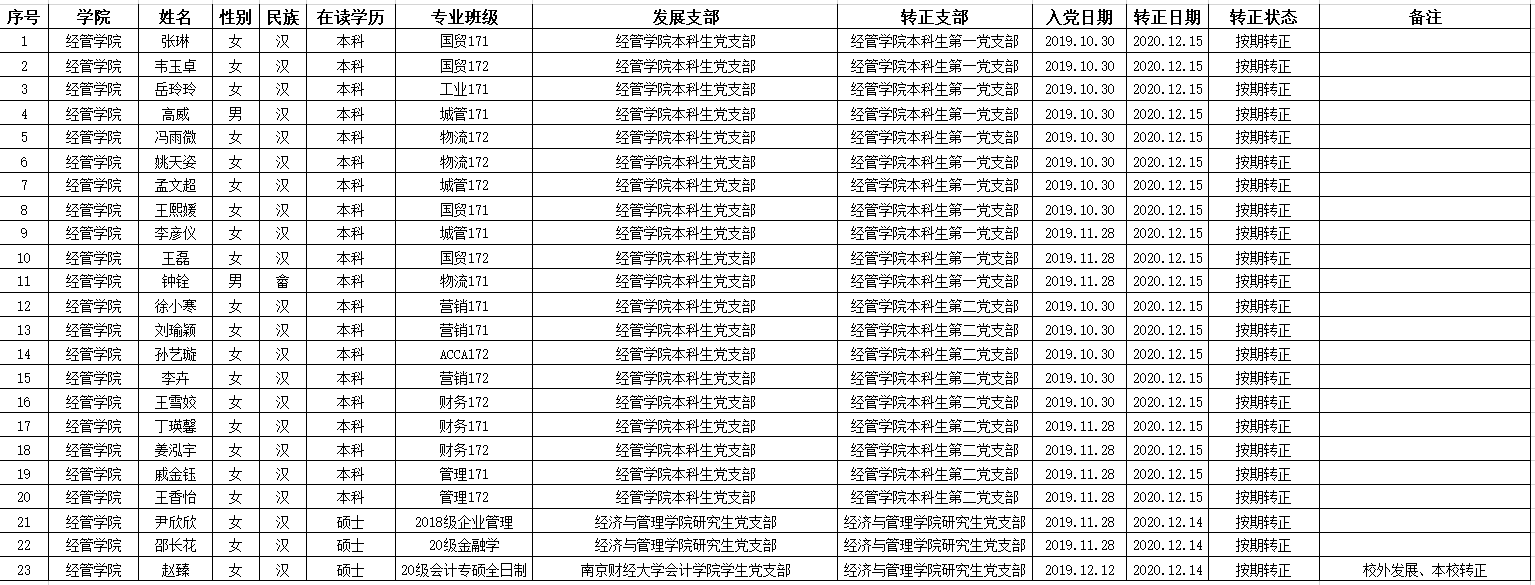 根据《中国共产党章程》和《中国共产党发展党员工作细则》及学校党委《关于发展学生党员工作的意见》(青科大党字〔2014〕77号)文件要求,经管学院学生党支部于2020年12月14日、15日召开预备党员转正大会讨论张琳等23位同志的转正问题,同意以上同志按期转为中共正式党员,现将该23名同志情况予以公示。公示期为2020年12月15日至2020年12月21日。如有异议,请于公示期内到经管学院党委反映。